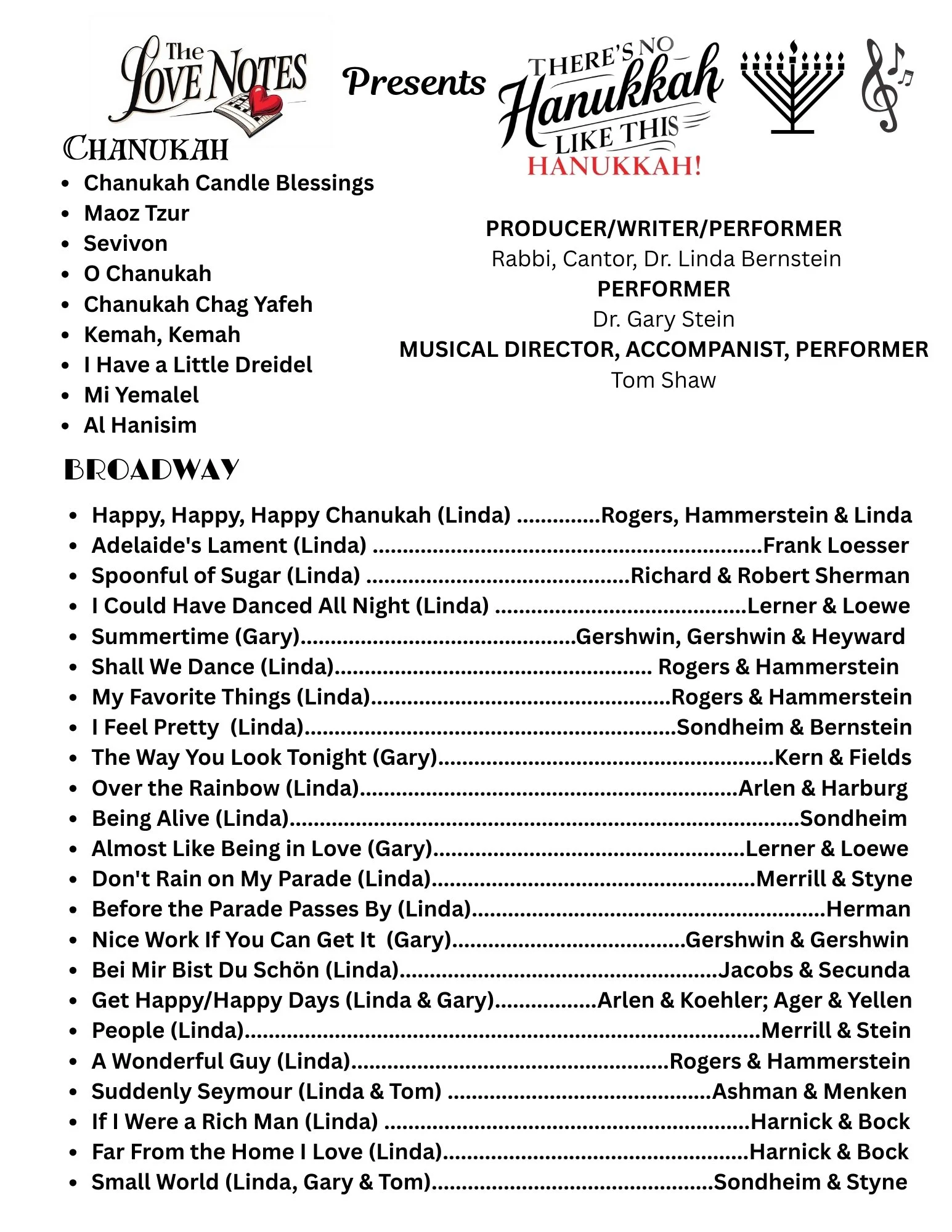 Rabbi, Cantor, Dr. Linda Bernstein: Rabbi Linda is the producer, creative director, writer and performer. She loves to do characters and accents and has received years of training in musical theater , acting, piano and guitar. She is also an award-winning Doctor of Pharmacy, producer, writer and host of educational media. She brings her knowledge and love of Broadway musicals to every performance. As the show’s moderator, she infuses heart and humor into every performance to totally engage the audience. No one leaves their seats until it’s over!!